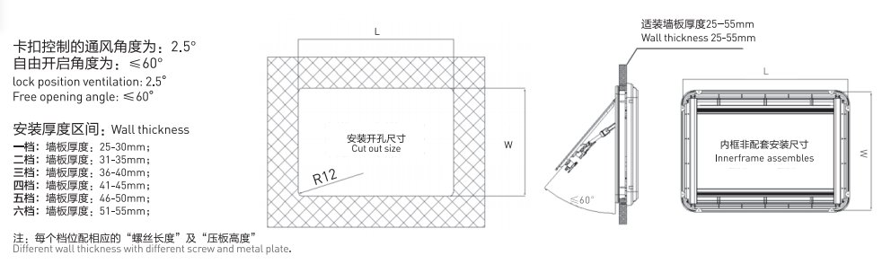 | 序号 Item | 规格型号 Spec | 外框外形尺寸 Overall size L*W (mm) | 开孔尺寸 Cut out size (LxW) (mm) | 最大开启角度 (K°) |